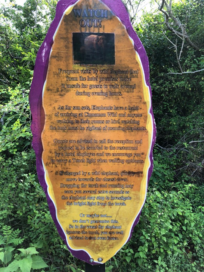 We spent four luxurious days at Cinnamon Wild just in awe of our surroundings, swimming in the beautiful pool, indulging in the buffet and spotting wildlife. We walked around the little resort cottages taking photos of monkeys and lizards. It was all fun and games until we stumbled across a lone wild boar. It probably stood about knee height and had a long pointy snout. Murray shimmered past the wild beast with Maya and Brooke in tow. He signaled for me to follow with Sienna but I swear it looked at me and was about to charge. Needless to say Sienna and I raced for our lives weaving through little cottage gardens. At one point we thought we were safe only to come face to face with about a dozen of them. Had he called his mates? Were they all after us now? Sienna and I by this stage were nearly hyperventilating ducking and weaving in every direction. We were spotted by a resort guide and escorted home. Apparently the wild boar are ‘quite harmless ‘ and like to eat the berries on the trees in the resort. Hmmmm … one for the wild boar. It wasn’t such a laughing matter however when later that night an elephant decided to come for a drink at the resort bar. Thankfully we were tucked up safely in our cottage but another guest showed us photos of the elephant strolling past the pool, through the bar and towards a guest’s car. It then started tearing branches off trees and lifted the car off the ground trying to get to some fruit inside it. That sign we saw on the first day …. it’s no joke.