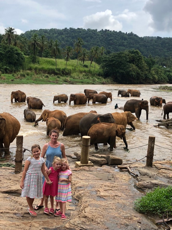 Our next stop on our journey was a hill town called Ella. It was picturesque and our homestay was literally on the edge of a mountain looking down a ridge. We went and saw the famous 9 arch bridge, over the railway track, visited a tea factory and chilled out at Cafe Chill ( they served beer). We then hopped on a train (7 hour journey) to the next stop, Kandy, or as Brooke and Sienna call it “that lolly place”. The train took us through tea plantations and small villages. You could hang out the window and wave to local villagers. It was an unforgettable journey through some of the prettiest scenery we have ever seen. The main attraction for us in Kandy was the Pinnawala elephant orphanage. You might have thought we had seen enough elephants by now but this place was quite special. It was home to about 50 orphan elephants and twice a day they are taken to a nearby river for a bath. We were lucky enough to witness this incredible event.